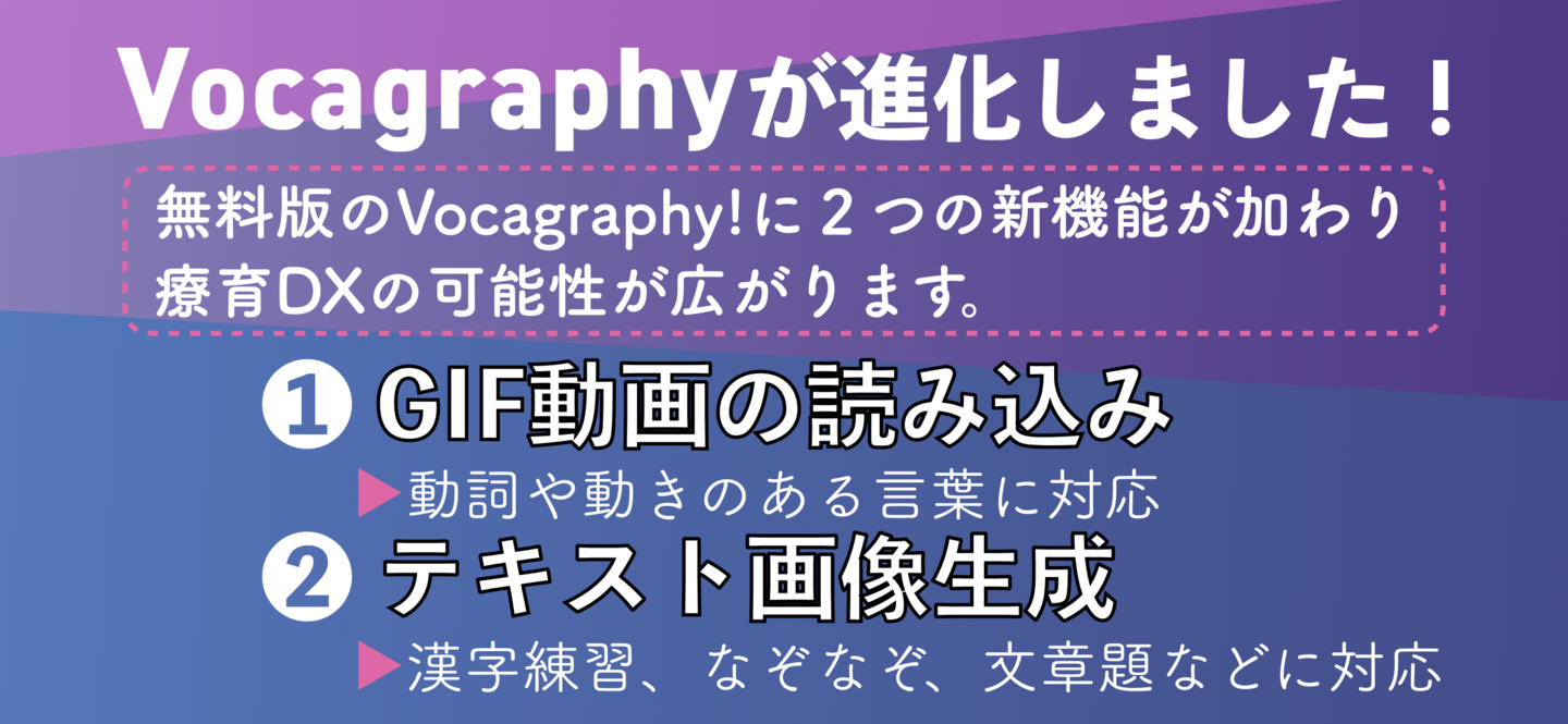 「Vocagraphy+(ボキャグラフィー・プラス)」は、 無料版の「Vocagraphy!(ボキャグラフィー)」を進化させた有料アプリ(¥480)です。より高度な学習を実現するために、「GIF動画の読み込み」と「テキスト画像生成」の2つの新機能を追加しました。